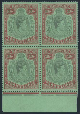 1624 (126b) image(126b), KGVI Ten Shilling sheet margin block of Green & Deep Lake on Pale Emerald, beautiful centering with wide margins, intensely rich colours, XF, natural streaky original gum as usual. Ex Lord Steinberg (SG #119, Cat £1,300) (Image) Estimate 750.00+ $Cdn