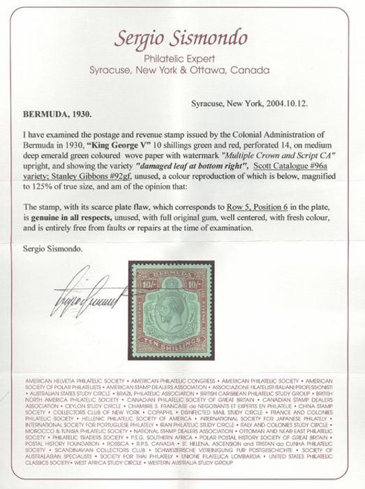 1604 96a image96a, KGV 10 Shilling with DAMAGED LEAF AT BOTTOM RIGHT variety, beautifully centered, rich strong colours, VF, OG. Has 2004 Sismondo Certificate (SG #92gf, Cat £700) (Image) (View Certificate)