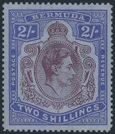 1614 123a image123a, KGVI 2 Shilling Deep Purple & Ultramarine on gray blue Line Perf 14.25. Has GASH IN CHIN variety, lovely centering, VF, LH, normal streaky gum. A RARE VARIETY ON THE LINE PERF ISSUE (SG #116bf, Cat £2,000) (Image) Estimate 1,250.00+ $Cdn