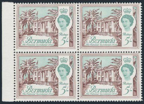 1634 252a image252a, QE 5 Shilling margin block with the SURCHARGE OMITTED ERROR. This error can be distinguished by the sideways watermark and PVA gum whereas the 1962 5Sh has the upright watermark. VF, NH. A MAJOR MODERN BERMUDA ERROR RARITY (Image) Cat 6,000.00