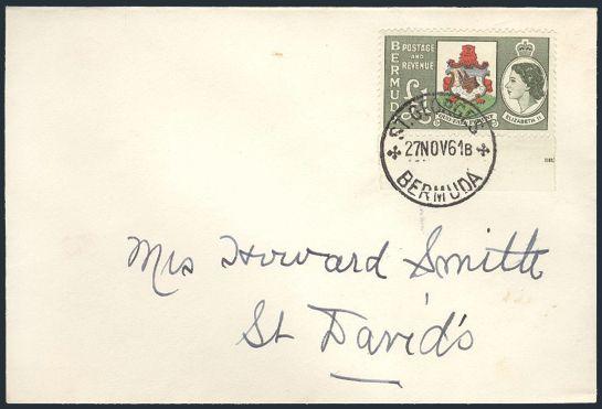 1629 162 image162, Sheet margin QE One Pound single neatly tied by St Georges 27 Nov, 1961 CDS on cover to St David's. VF (Image) Estimate 65.00+ $Cdn