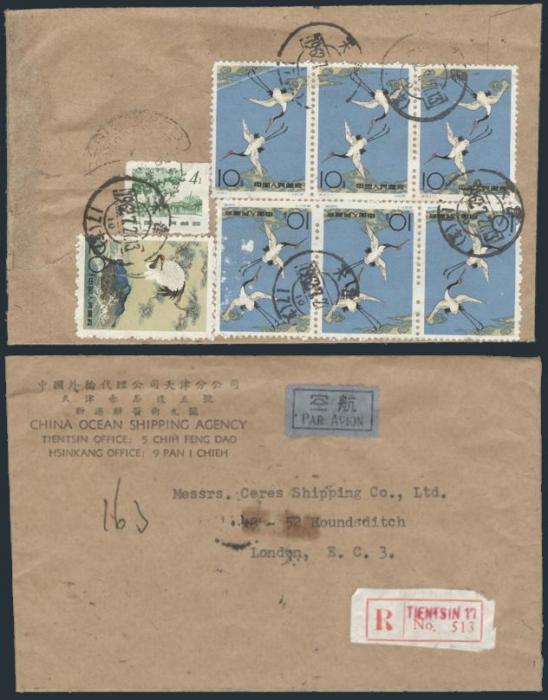 1787 578, 613, 614 image578, 613 (6), 614, Tied by Tientsin 27 July 1962 CDS's on Reg'd Airmail cover to England. Has China Ocean Shipping Agency corner card. F (Image) Estimate 75.00+ $Cdn