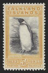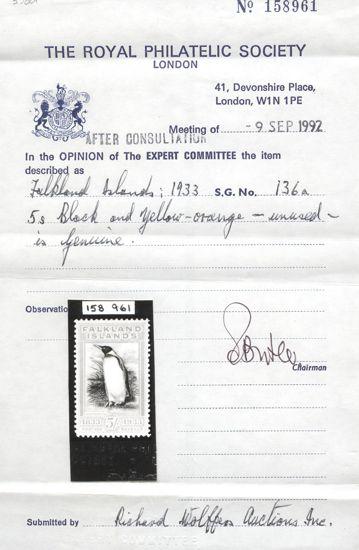 1947 74a image74a, The rare 5 Shilling Penguin YELLOW ORANGE & BLACK. Perfectly centered, fresh rich colour, XF, OG. Has 1992 Royal Philatelic Society Certificate (Image) (View Certificate)