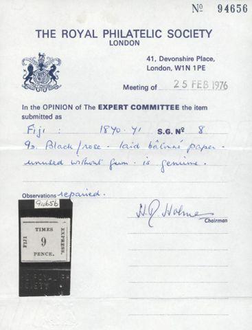 2001 9 image9, Scarce Nine Pence on pink laid Batonne Paper (Gillis Paper Type 3, Position 23), showing roulettes on 2 sides, F, NG, expert repair. This stamp is without the thickened lines of the Battone paper which is rarer than normal (SG notes "worth a premium"). Has Stolow guarantee b/s and 1976 Royal Philatelic Certificate. Ex Gillis (Image) (View Certificate)