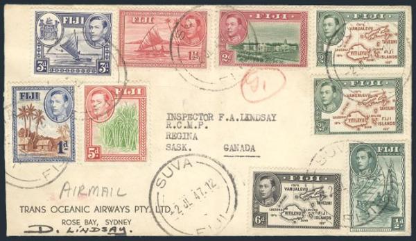 2010 117/135 image117/135, Nine KGVI stamps neatly tied by Suva 2 July, 1947 CDS's on airmail cover addr to an RCMP Inspector in Regina, Canada. Has Trans Oceanic Airways Pty Ltd. corner card. F (Image) Estimate 50.00+ $Cdn