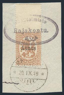 2033 96 image96, With "Aunus" Occupation overprint tied on piece by 20 Sept 1919 CDS & "Rajakontu" oval h/s. VF, has guarantee b/s (Image) Estimate 150.00+ $Cdn