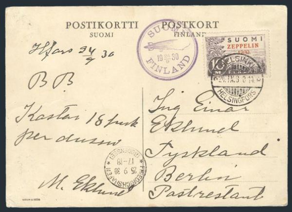 2037 C1 imageC1, Tied on cach GRAF ZEPPELIN Sept 1930 Baltic Sea Flight postcard, addr to Berlin. F-VF, some mounting adhesions / flaws on reverse (Image) Estimate 350.00+ $Cdn