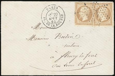 2049 32 image32 (2), Tied by Paris "1" star on cover with 27 Aug 1865 alongside to Lyons La Foret. VF (Image) Estimate 75.00+ $Cdn
