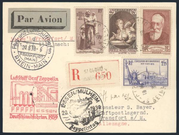 2063 355-6, 372, B54, B92-3 image355-6, 372, B54, B92-3; plus Germany #428, Tied back & front on double cach GRAF ZEPPELIN Aug 1939 Reg'd Essen / Mulheim Flight postcard. Addr to Frankfurt. VF. Attractive (Image) Estimate 350.00+ $Cdn