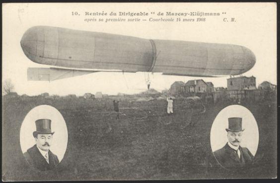2058 162 image162, Tied on 1908 b/w postcard depicting the MARCAY-KLUIJTMANS DIRIGIBLE. This was an unsuccessful pioneer French airship. Has inset portraits of the two designers. VF (Image) Estimate 50.00+ $Cdn