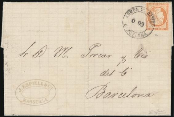 2054 59 image59, Tied by Barcelona (Spain) double-ring cancel on 1875 commercial entire written from Marsalla, addressed locally. Has oval company h/s from Marseilles. F, file fold away from stamp and markings. Has pencil guarantee in LR corner. A LOVELY FRANCE USED IN SPAIN COVER (Image) Estimate 250.00+ $Cdn