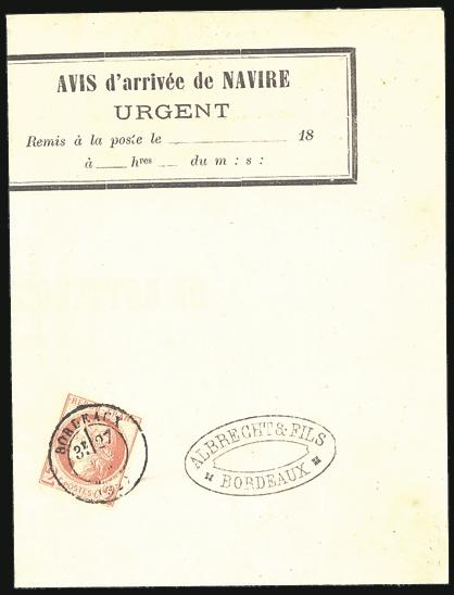 2052 51 image51, Tied by Bordeaux 27 Sept 1874 CDS on pre-printed ARRIVAL OF SHIP NOTICE addressed to Albrecht and Fils in Bordeaux. Inside has nice illustrated engraving showing an early sailing ship. F (Image) Estimate 200.00+ $Cdn
