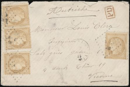 2053 56 image56 (4), Tied on 1873 cover to Vienna Austria (rec b/s). Has boxed red "PD" h/s. VG+, some opening flts at top (Image) Estimate 50.00+ $Cdn