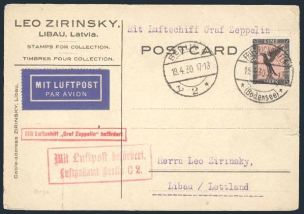 2281 C32 imageC32, Tied by Friedrichshafen 15 Ap, 1930 CDS on postcard from stamp dealer in Latvia & return. Has Berlin & Paris 19 Apr transits & red boxed "flown aboard GRAF ZEPPELIN" & Berlin Airmail transit h/s's. F-VF, tiny edge tear (Image) Estimate 175.00+ $Cdn