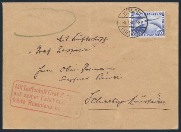 2288 C38 imageC38, Tied on cach GRAF ZEPPELIN July 1930 Rheinland Flight cover (Cologne to Koblenz leg); addr to Schneeberg. F-VF, centre fold. Scarce franking (Image) Estimate 225.00+ $Cdn