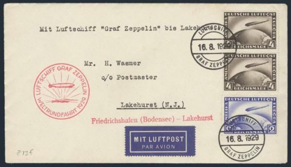 2286 C36 imageC36, C37 (Pair), Neatly tied by 16 Aug 1929 on board postmarks on cacheted Friedrichshafen to Lakehurst New Jersey GRAF ZEPPELIN flight cover. Nice cancels and franking. VF (Image) Estimate 200.00+ $Cdn