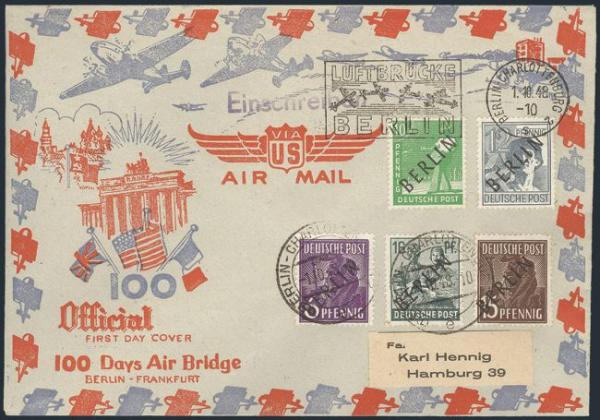 2351 9N1-16 image9N1-16, Tied by Berlin - Charlottenburg CDS's & Berlin - Charlottenburg AIR LIFT slogan cancels, 1 Oct 1948, on 8 diff covers. Each cover with a cach "100 DAYS AIR BRIDGE" Airmail special event covers to Hamburg. VF. Very attractive (8 covers) (Image) Estimate 350.00+ $Cdn