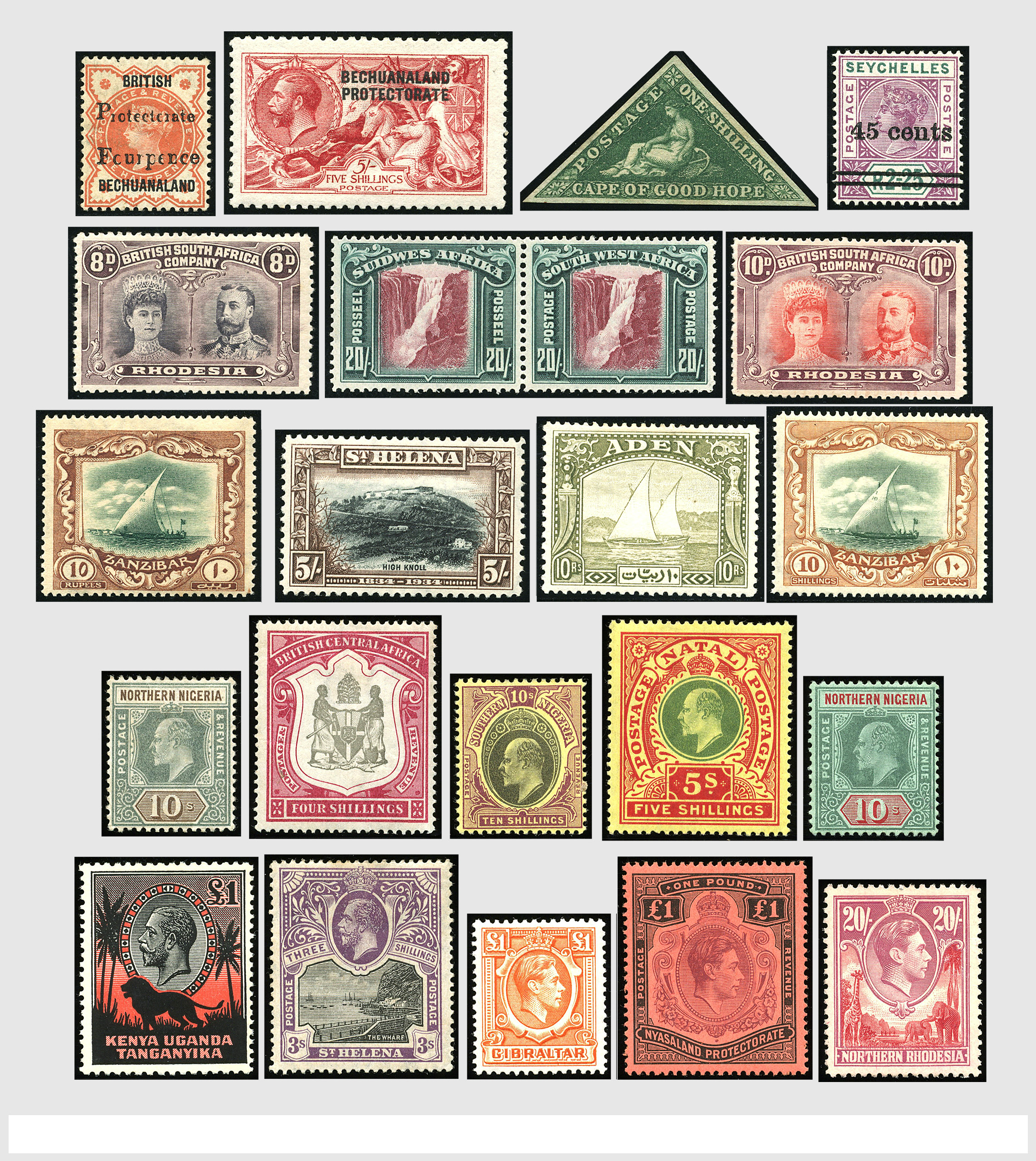48, 50, South West Africa 74/87 pairs, Zanzibar 295, 320/322, Rhodesia 21 double heads etc, etc. For images please visit our website (Image) (Image2)