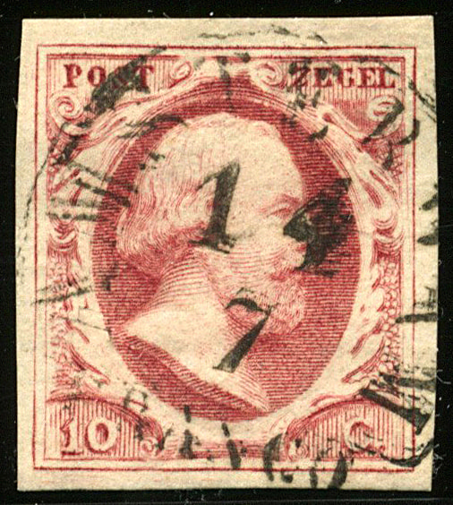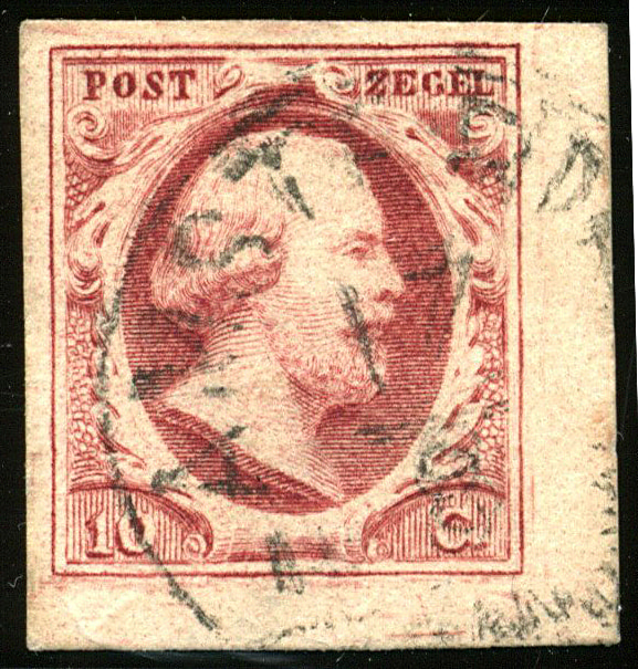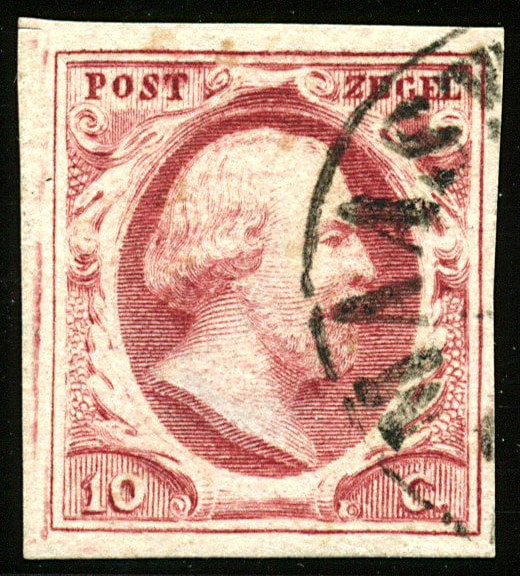 2c-Pl.IA, 10 Cent diepdonkerkarmijn plaat IA, afgestempeld in Maastricht. Vol tot breed gerand prachtex. Van Balen Blanken nr. A3041. Ontdekt op 18-6-1977 (Amphila), ex Mezger, Seijger. Afgebeeld op omslag cat. 556 (mei 1995). € 3750 (Image)