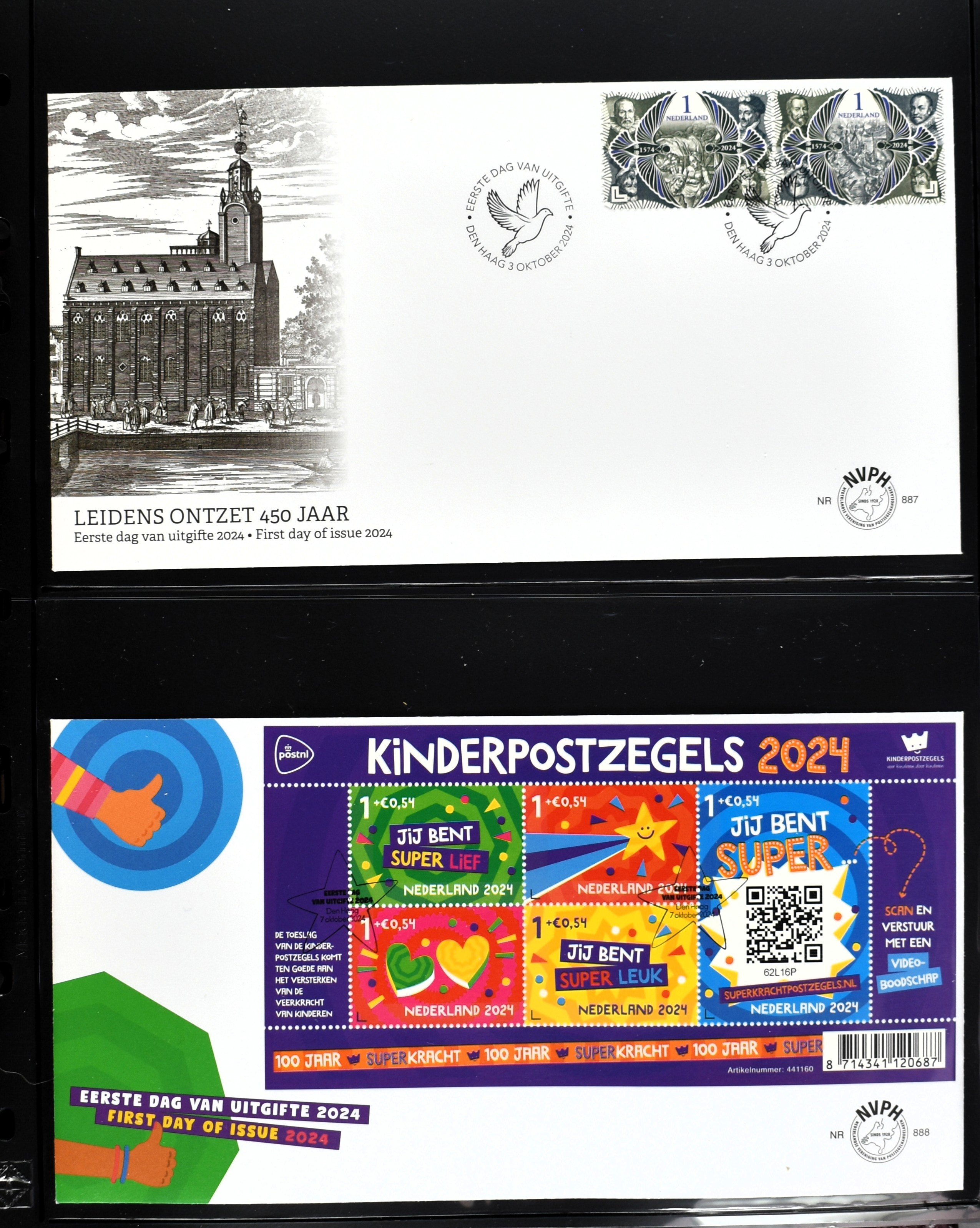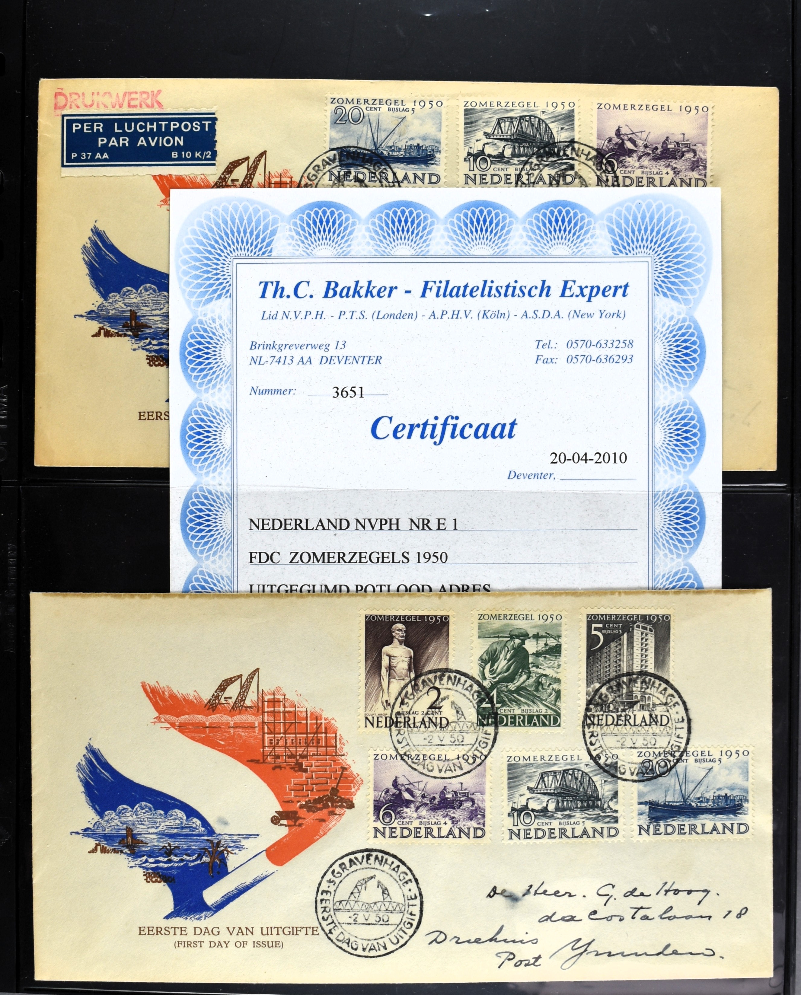 24 imageNEDERLAND, verzameling FDCs vanaf E1 t/m E839 in 13 Leuchtturm bandjes tot E60 beschreven/getypt adres waarbij E1 (2x waarvan 1 Exemplaar met certificaat) alsmede 7 mappen met speciaal-uitgiften. Totaal in 2 verhuisdozen (Image) (Image2) (Image3) (Image4) (Image5)