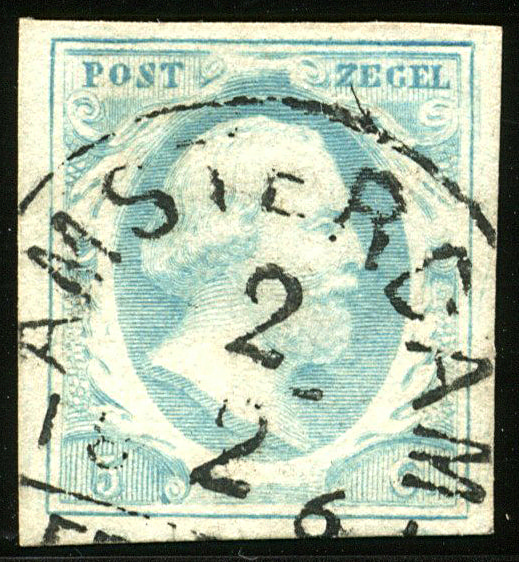 AMSTERDAM C type XVII (de H/S R) op 15 cent nr. 3c, pos. 50. Pracht randstuk (az. rood stempeltje) met een van de mooist bekende afdrukken van dit op de 15 cent zeldzame stempel (Image)