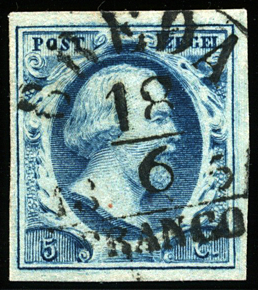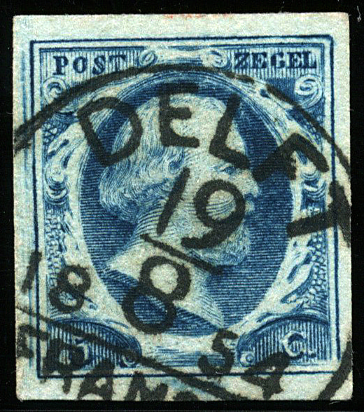 DELFT C type I (de H/S 50) op 5 cent nr. 1d-Pl.II-12. Prachtig gerande zegel met de mooist bekende afst. Afgebeeld in de H/S (Image)
