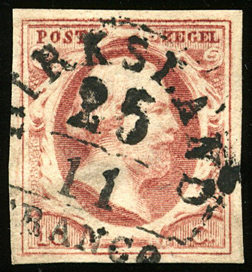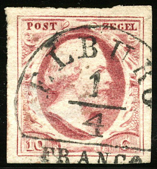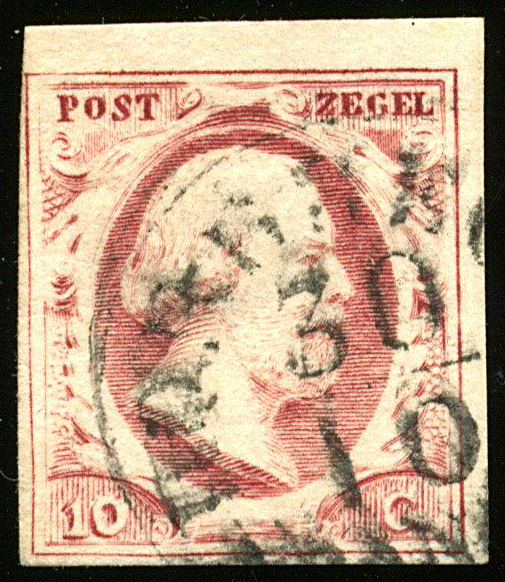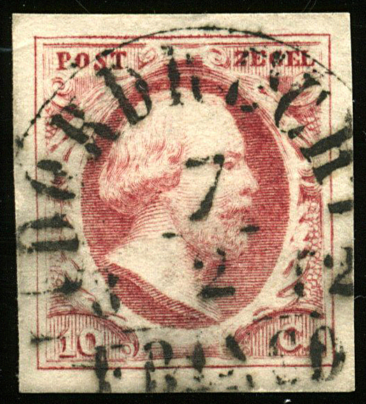 DORDRECHT A (de H/S R) op 10 cent nr. 2b-Pl.I-48. Smal tot breed gerand prachtex. met nagenoeg volledige afdruk van dit zeldzame stempel. Zelden aangeboden!