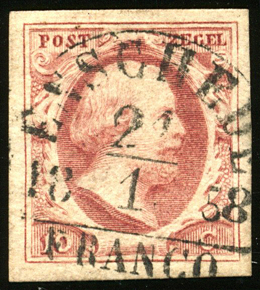 DORDRECHT B (de H/S 50) op 10 cent nr. 2a-Pl.I-35. Breed gerand prachtex. met een van de ons mooist bekende afst. met vrij vroege datum 7-2-1852