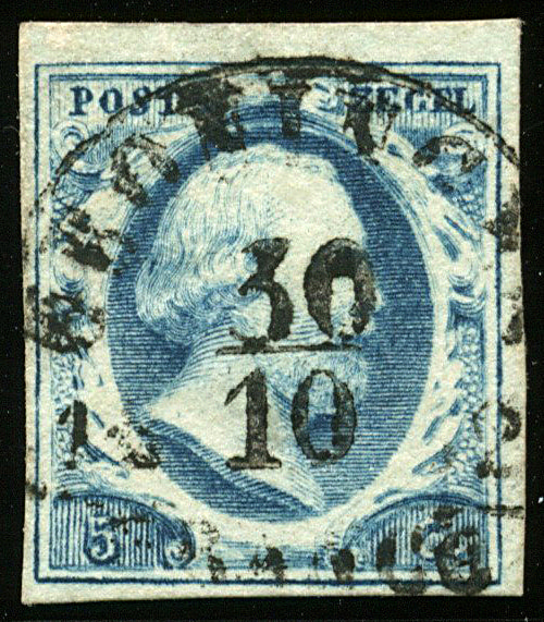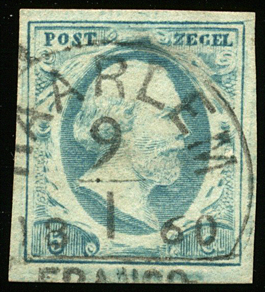 HAARLEM B type I (de H/S 100) op 5 cent nr. 1b-Pl.I. Breed tot zeer breed gerande zegel met volledige, iets gevlekte afst. (Image)