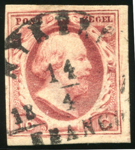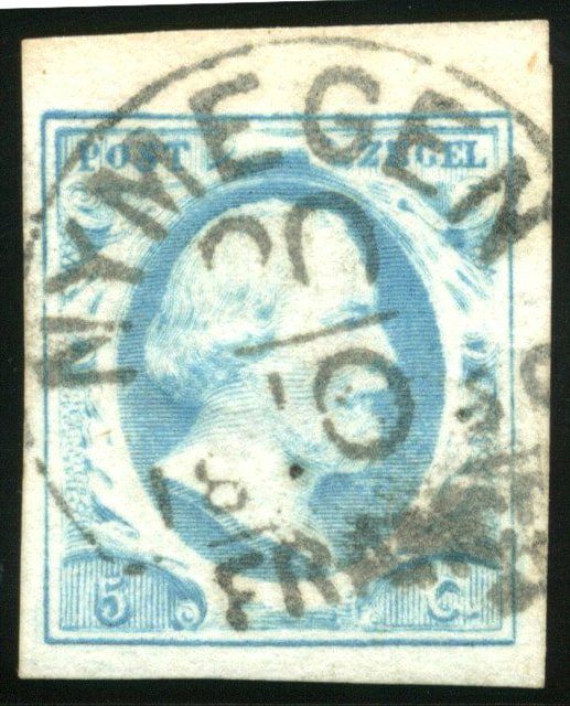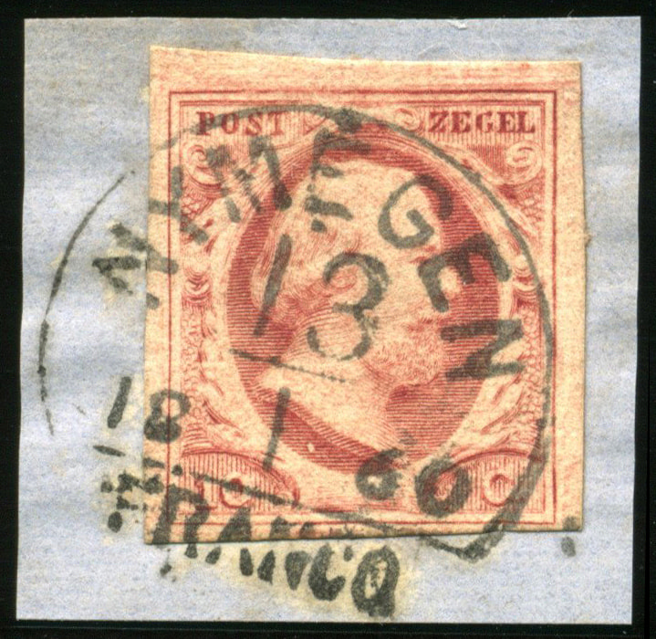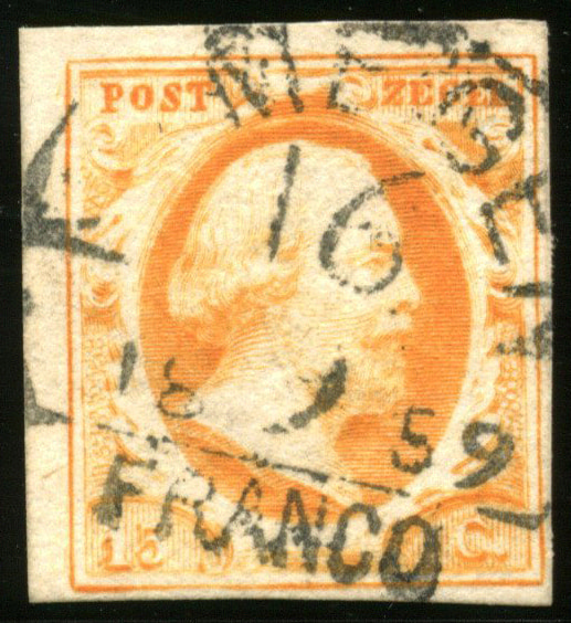 NYMEGEN C type I (de H/S RR) op 15 cent. Wat smal (onder, rechts) tot breed (boven, links) gerande zegel met voor dit op de 15 cent zeer zeldzame stempel een vrijwel ideale, volledige afst. van 16-9-1859 (Image)