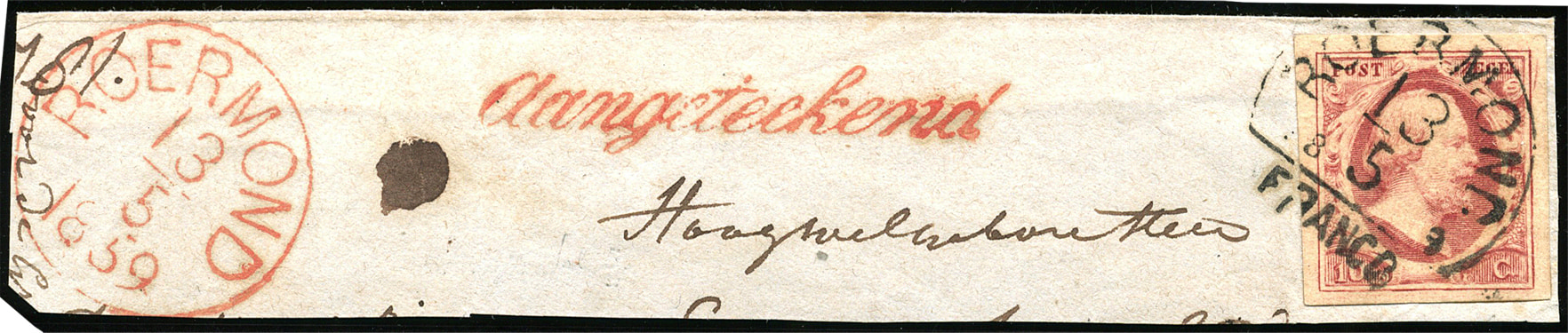 ROERMOND C type I (de H/S 50) op 10 cent. Breed gerand prachtex. op briefstuk waarop tevens een rondstempel en cursief Aangeteekend (Image)