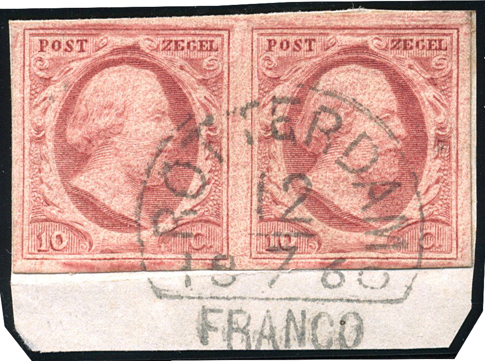 ROTTERDAM C type VII 'met de liggende 0' van 60 (de H/S 50) op 10 cent nr. 2j-Pl.V. Prachtpaar op knipsel met volledige afst. (Image)