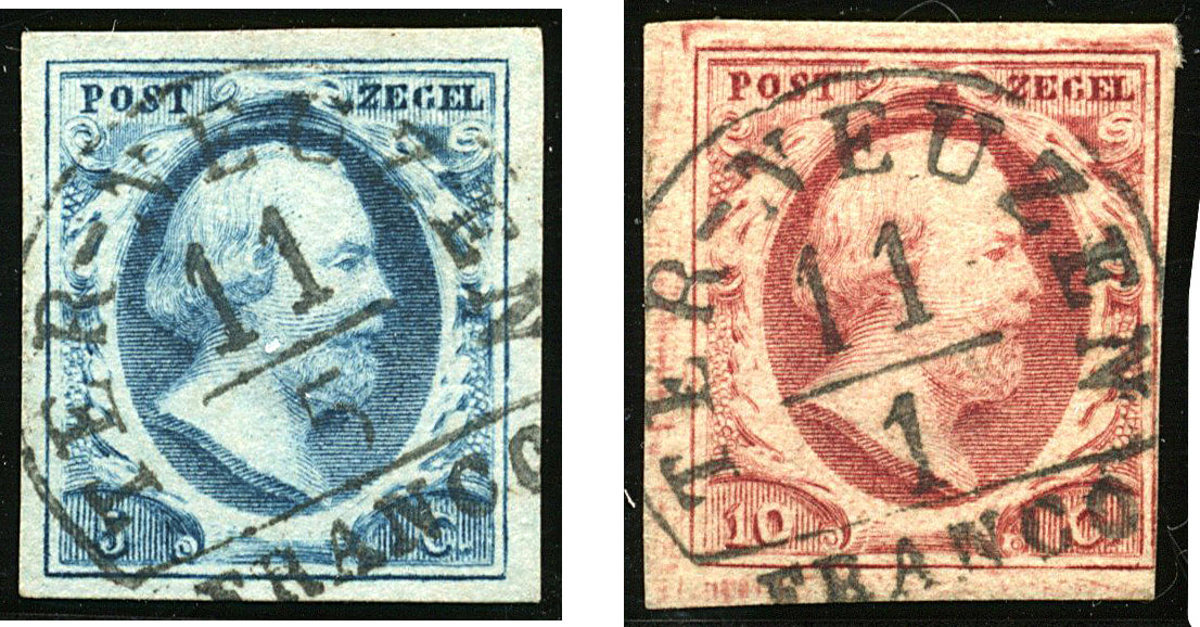 TER-NEUZEN A (de H/S 100 resp. 125) op 5 cent nr. 1b-Pl.I-72 (prachtex.) resp. 10 cent (rechts onder loeprand, overigens vol tot breed gerand). Beide zegels met ideale afst. (Image)