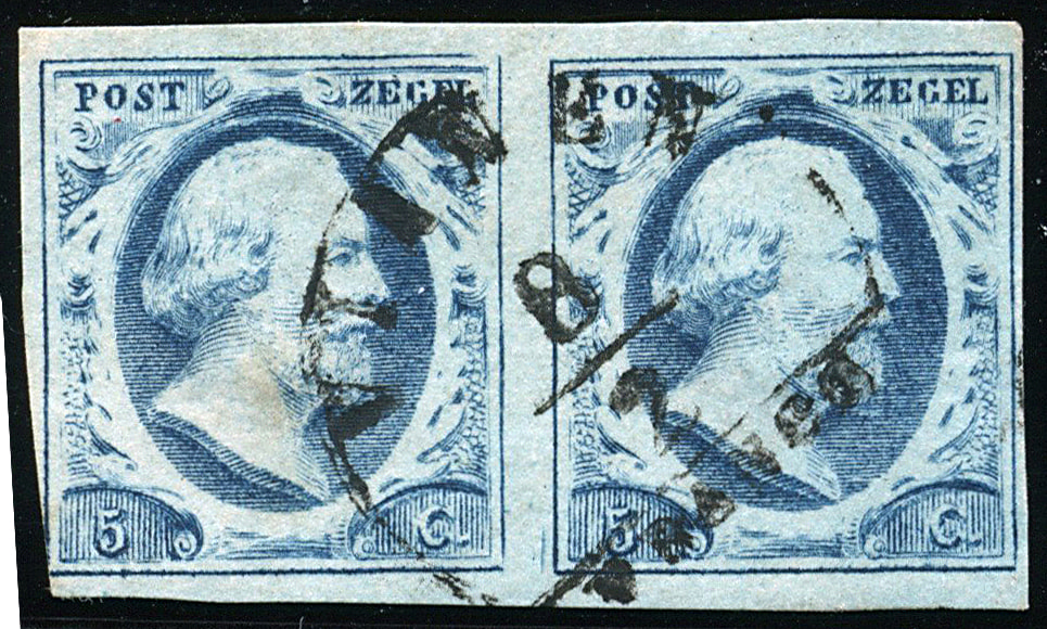 VIANEN A (de H/S 300) op 5 cent nr. 1f-Pl.II-59/60. Links onder net even aangesneden, rechter rand smal, overigens mooi gerand paar met prima centrale afst.
