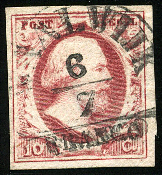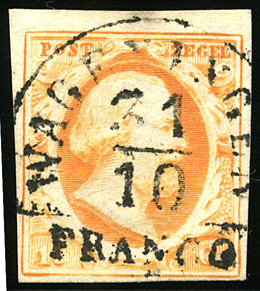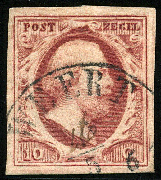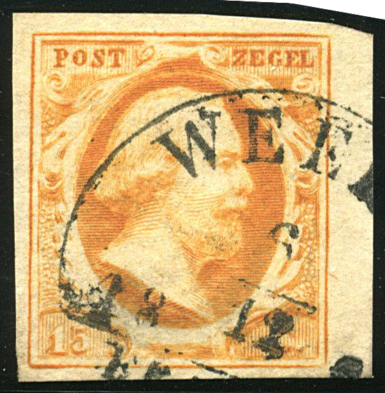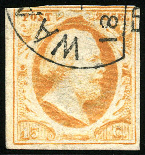 WAALWYK C op 15 cent. Zegel heeft drie prima randen, boven smal, links aangesneden, met gedeeltelijke afdruk van dit op de 15 cent uiterst zeldzame stempel, waarvan een volledigere afdruk niet bekend is (zie de H/S) (Image)