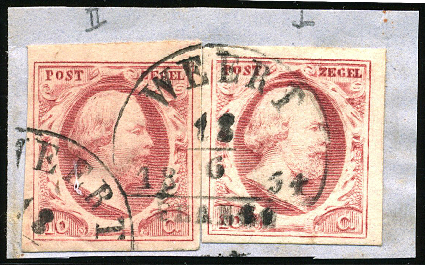 WEERT B type I (de H/S 100) op 10 cent nr. 2b-Pl.I-78 en nr. 2d-Pl.II-47. Twee prachtex. van verschillende platen (!) op knipsel met volledige afst. Schaars duo! (Image)