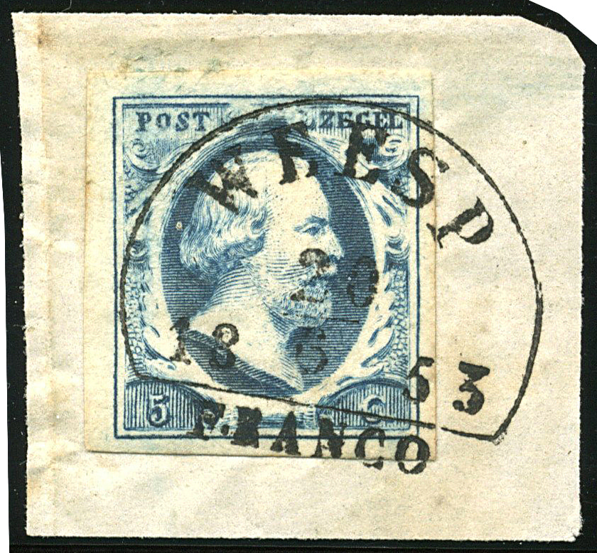 WEESP B type I (de H/S 75) op 5 cent nr. 1c-Pl.I. Prachtex. op knipsel met bijzonder mooie afst. (Image)