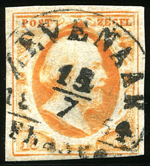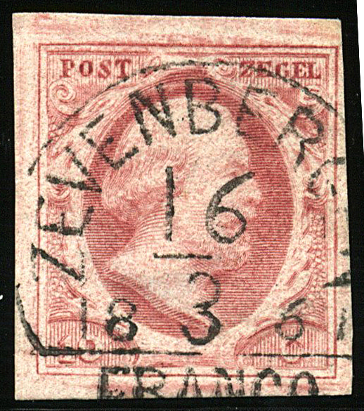 ZEVENBERGEN C (de H/S RRR) op 15 cent nr. 3b, pos. 79. Fraaie zegel (enkele kleine gebreken) met gedeeltelijke afst. Een onderscheidend verschil met Steenbergen C is de G. Ondanks de zegelkwaliteit een hoogst zelden aangeboden rariteit (Image)