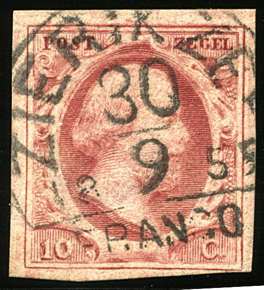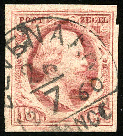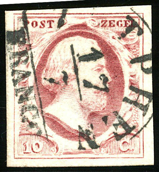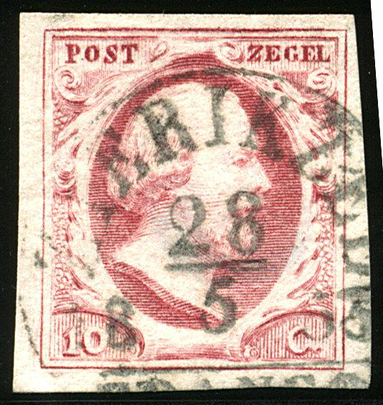 ZEVENAAR B (de H/S 125) op 10 cent. Breed tot zeer breed gerande zegel, az. links dun plekje in rand, rechts deel buurzegel, met roodzwarte afst.