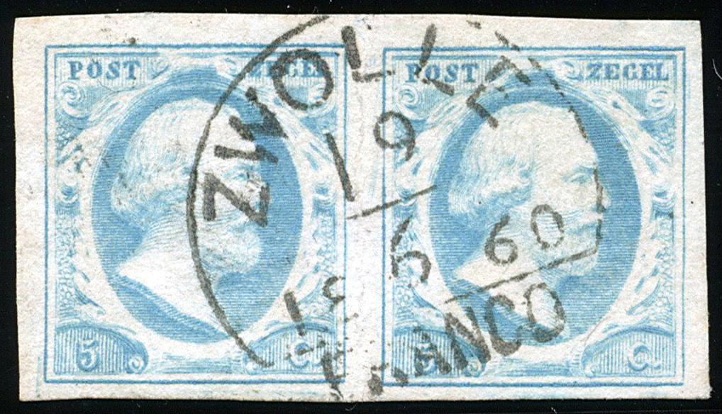 ZWOLLE C type III (de H/S 50) op 5 cent nr. 1n-Pl.IV-61/62. Vol tot breed gerand paar (met vouw tussen de zegels), met volledige, centrale afst.