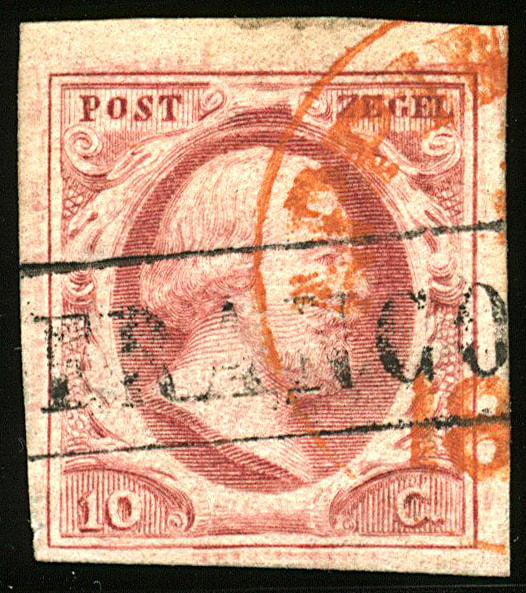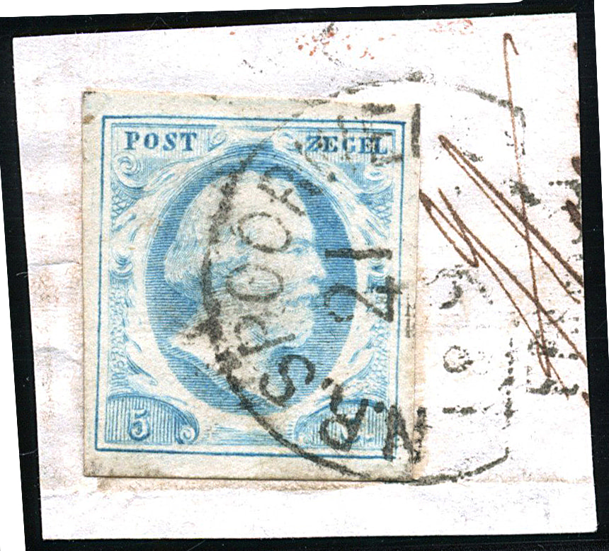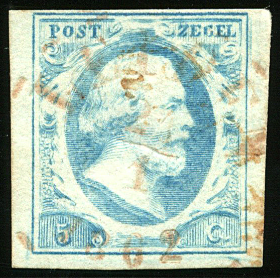 992 o imageGebroken cirkelstempel LEIDEN (K.65) in rood op 5 cent nr. 1n-Pl.IV-51. Aan drie zijden breed gerande zegel met volledige afst. met datum 23-1-1862. EY. tabel 13.1, € 250 (Image)