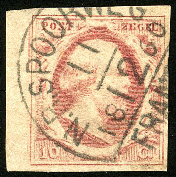 985 o imageH.SPOORWEG C type I (de H/S 125) op 10 cent nr. 2i-Pl.V-36. Schitterend gerande zegel met nagenoeg ideale afst. (onder 26 fragment stempel in rood, lijkt op een 4 onder een streep) (Image)