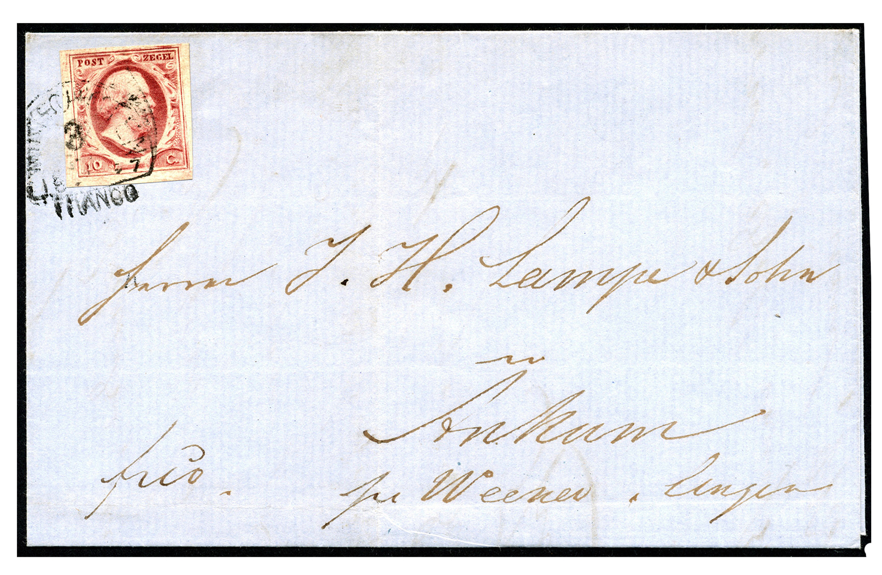 1043 on cover imageBuitenlandse bestemmingen. Duitsland. Pruisen. 10 Cent gedeeltelijk geplakt over de rechter rand van de 15 cent, smal tot breed gerande zegels, op complete brief van Arnhem 19-5-1853 via Oberhausen 19-5 naar Dillenburg 20-5, de geboorteplaats van Willem van Oranje. Port voor brieven 0-15 gram: Arnhem ligt minder dan 30 km van Duitse grens = 5 cent + afstand in Pruisen van grens tot Dillenburg is meer dan 20 Duitse mijl (1 mijl is ca. 7,5 km) is 3 Silbergroschen is 20 cent, tezamen 25 cent (info: collectie Bouwe Brandsma, Postverkeer tussen Nederland en de Oud-Duitse staten 1852-1900, Corinphila 2014, p.88). Schaars tarief! (Image)