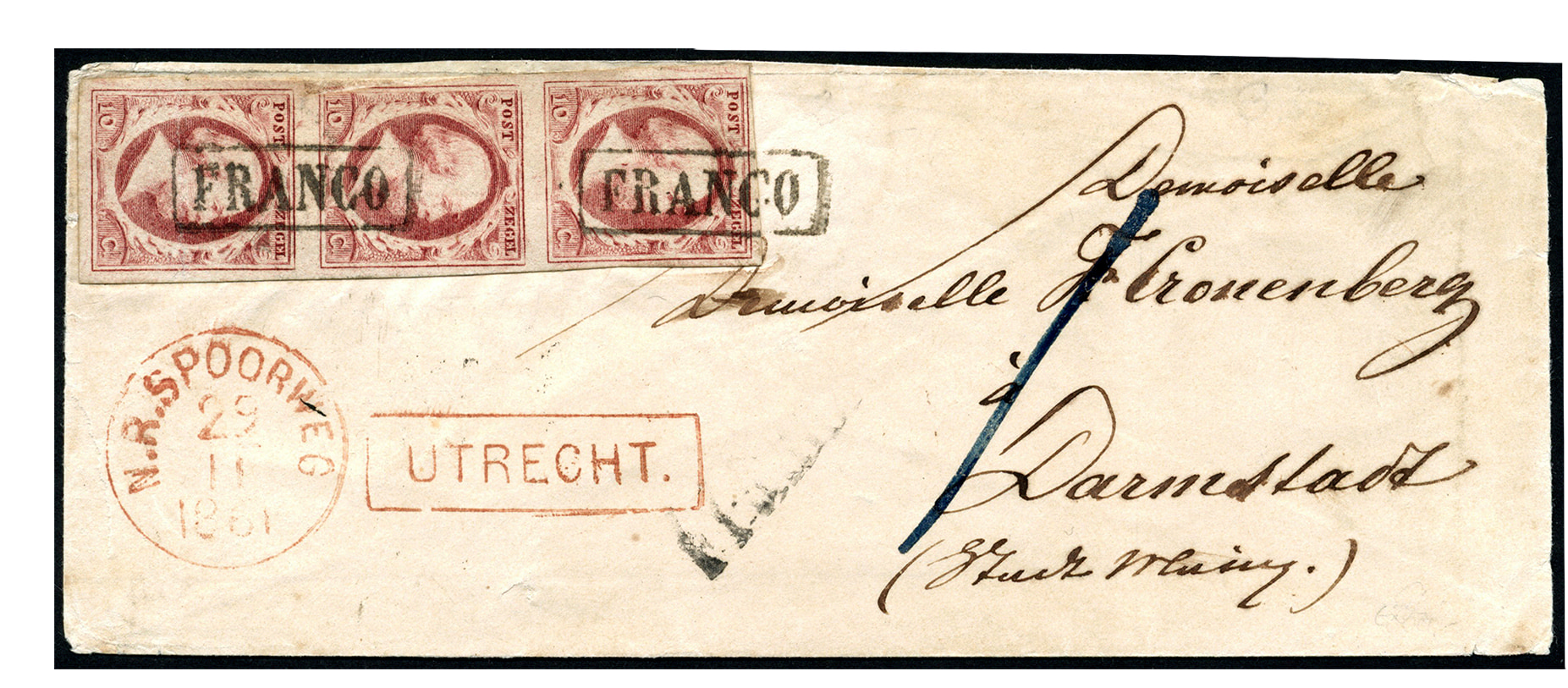 1041 on cover imageBuitenlandse bestemmingen. Duitsland. 10 Cent nr. 2m-Pl.VII-4/9/14, fraaie verticale strip op envelop met haltestempel Utrecht, deels per N.R.Spoorweg 29-11-1861 via traject Emmerich/Oberhausen 30-11 naar een 'Demoiselle' te Darmstadt 1-12. Tarief 30 cent, zie: Van Hussen, p.208-209 (Image)