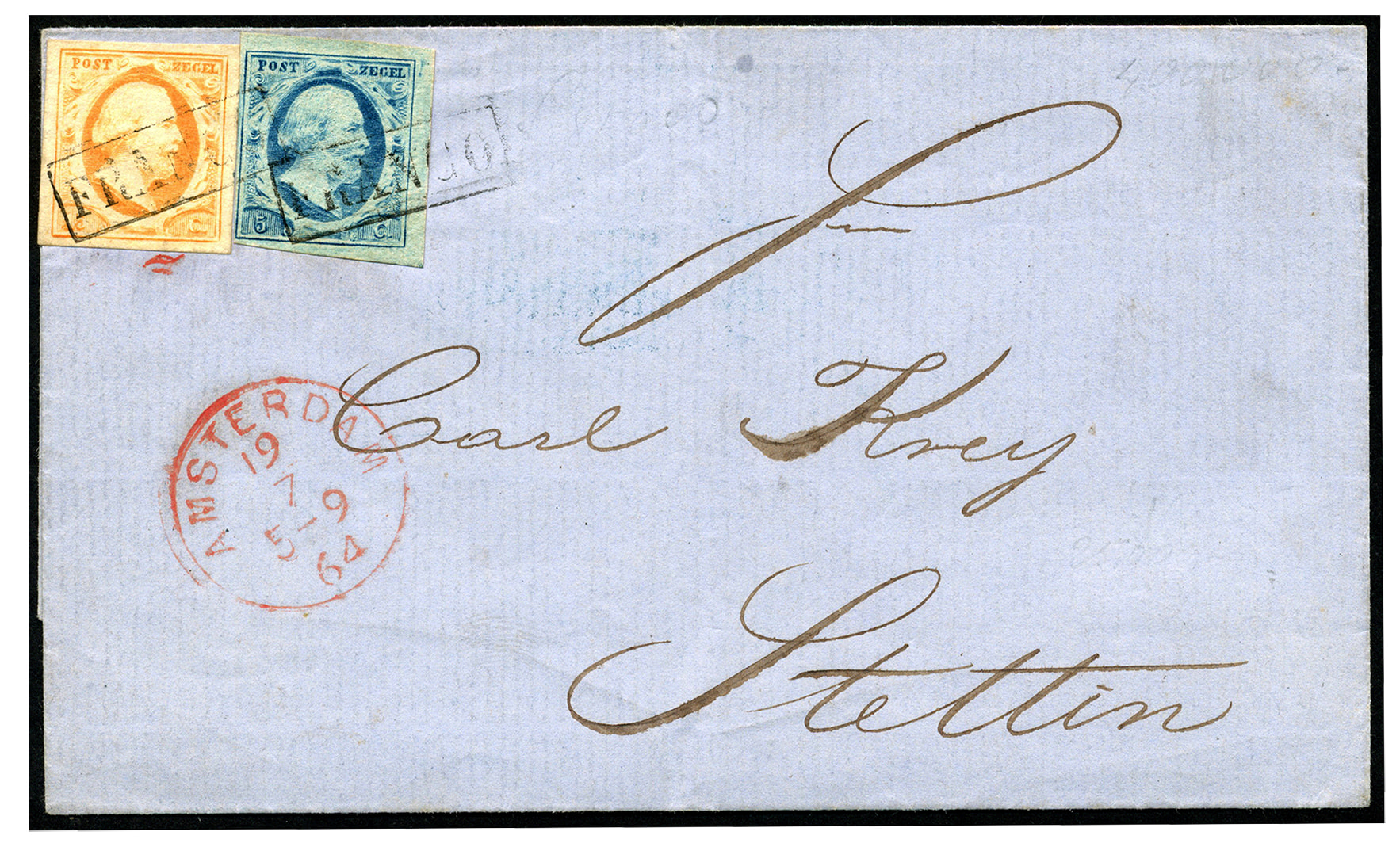 1042 imageBuitenlandse bestemmingen. Duitsland. Pruisen. 5 Cent nr. 1r-Pl.VI-36 (aan 3 zijden zeer breed gerand) en 15 cent nr. 3c, pos. 25 (prachtig gerand ex.) op frisse briefomslag van Amsterdam 19-7-1864 via traject Emmerich/Oberhausen 20-7 naar Stettin 21-7. 20 Cent is sinds 1864 het tarief voor brieven van de 1e gew. klasse naar Pruisen. Cert. Vleeming (2016) (Image)