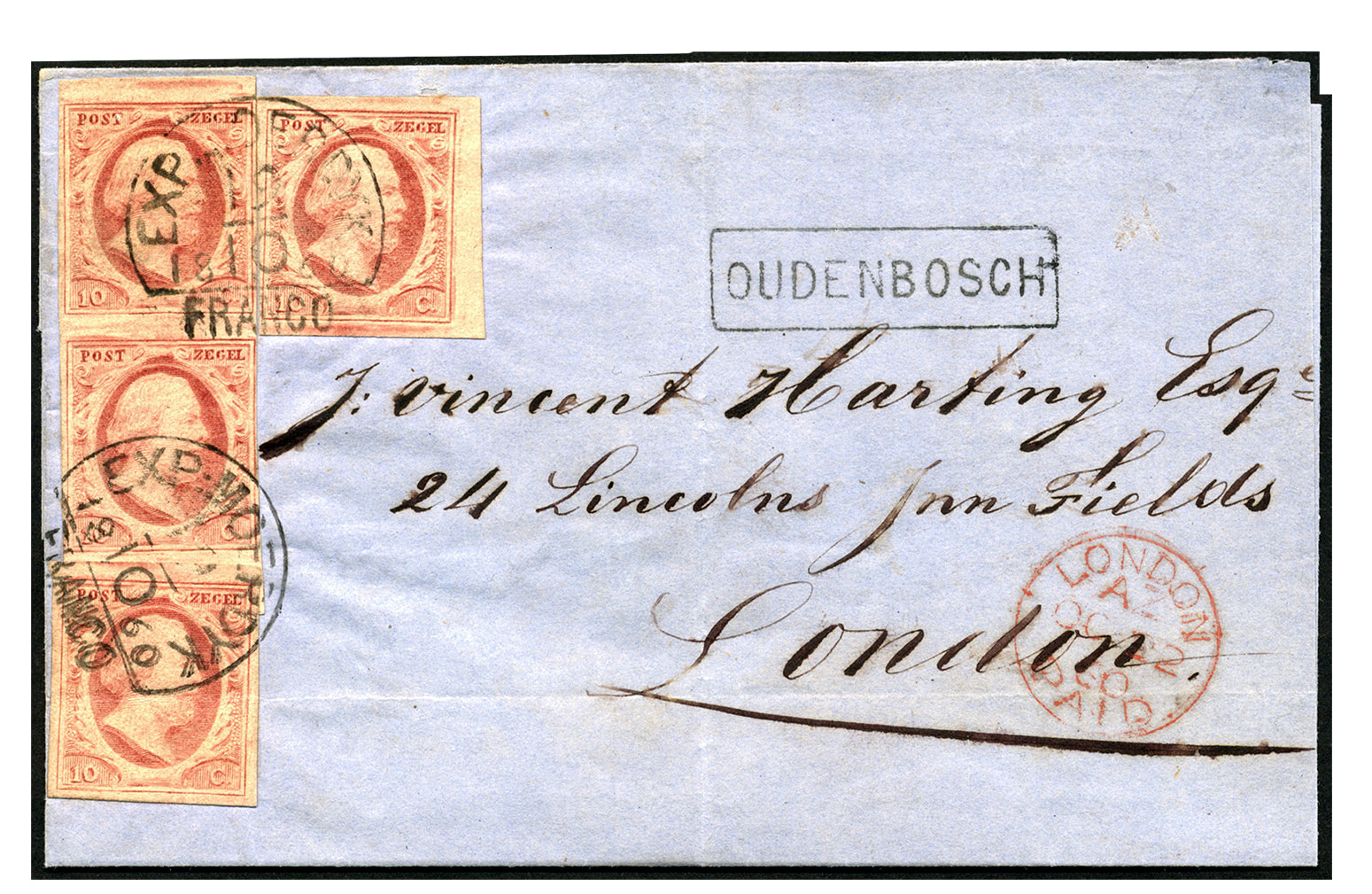 1044 on cover imageBuitenlandse bestemmingen. Groot-Brittannië. 10 Cent, vier exemplaren w.o. verticaal paar, met randen variërend van loeprand tot zeer breed, 2x afgestempeld EXP:MOERDYK 19-10-18620 op briefomslag van hulppostkantoor Oudenbosch (az. naamstempel in blauw) met op vz. haltestempel OUDENBOSCH, verzonden naar London 22-10-1860. Info bijgesloten. Tarief 40 cent, zie: Van Hussen, p.235 (Image)