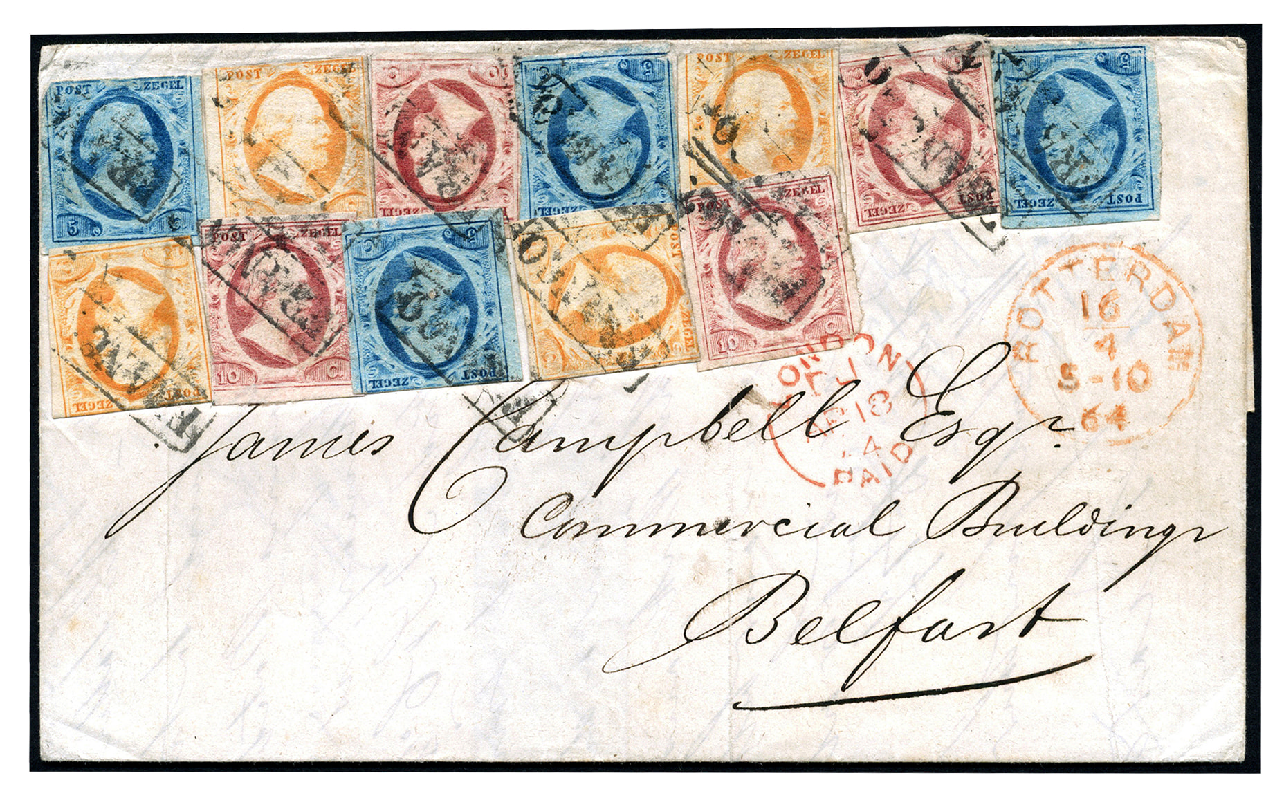 1045 on cover imageBuitenlandse bestemmingen. Groot-Brittannië. Vier (!!) tricolores op brief van Rotterdam 16-4-1864 via London 18-4-1864 naar Campbell in Belfast 19-4-1864. De brief moet tussen de 30-45 gram hebben gewogen: 3x 40 cent = 120 cent. Tarief: zie Van Hussen, p.235-236. Ondanks dat de zegels de kwalificatie 'fraai' niet overstijgen, is dit een uitzonderlijke, kleurrijke frankering die het filatelistische oog aangenaam treft (Image)