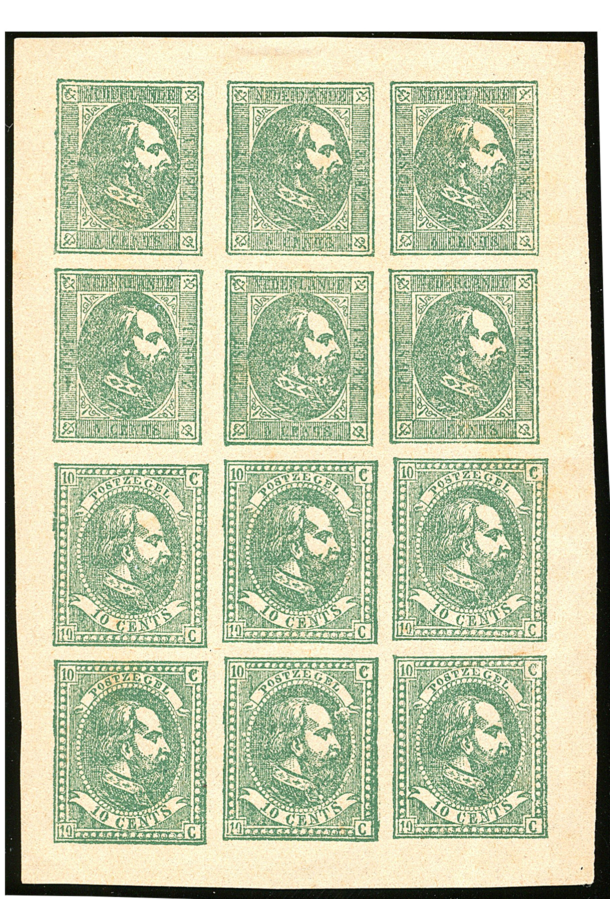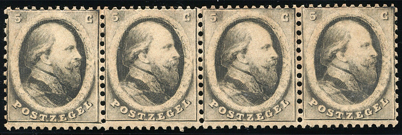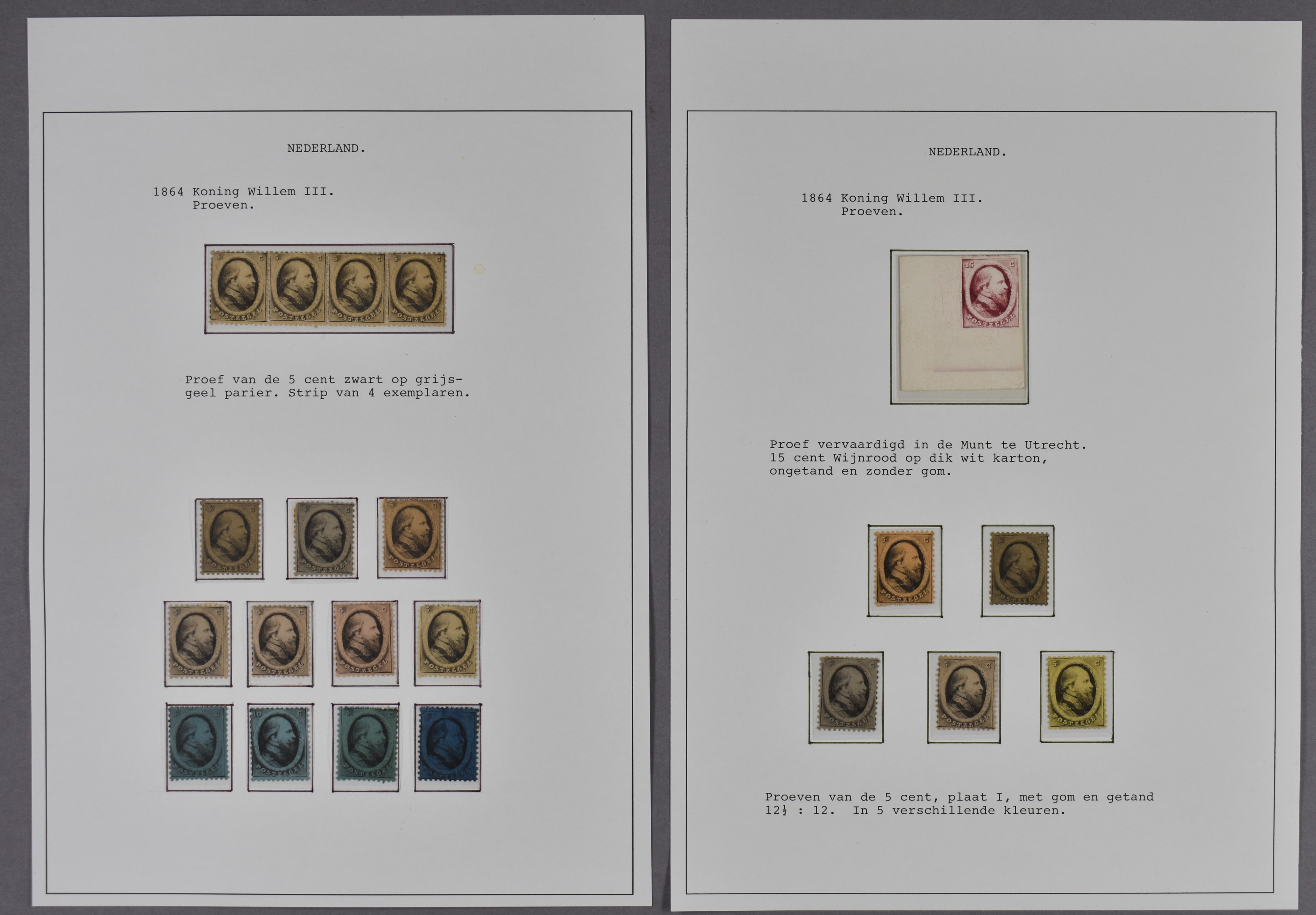 1101 (og)/og imageProeven van de emissie 1864, waarbij PC 23c en PC 25, 5 cent plaat I, gegomd en getand 12½ : 12, 16 losse ex. en 1 strip van vier, zwart op verschillende kleuren papier. Hfl. 3150 (Image) (Image2)