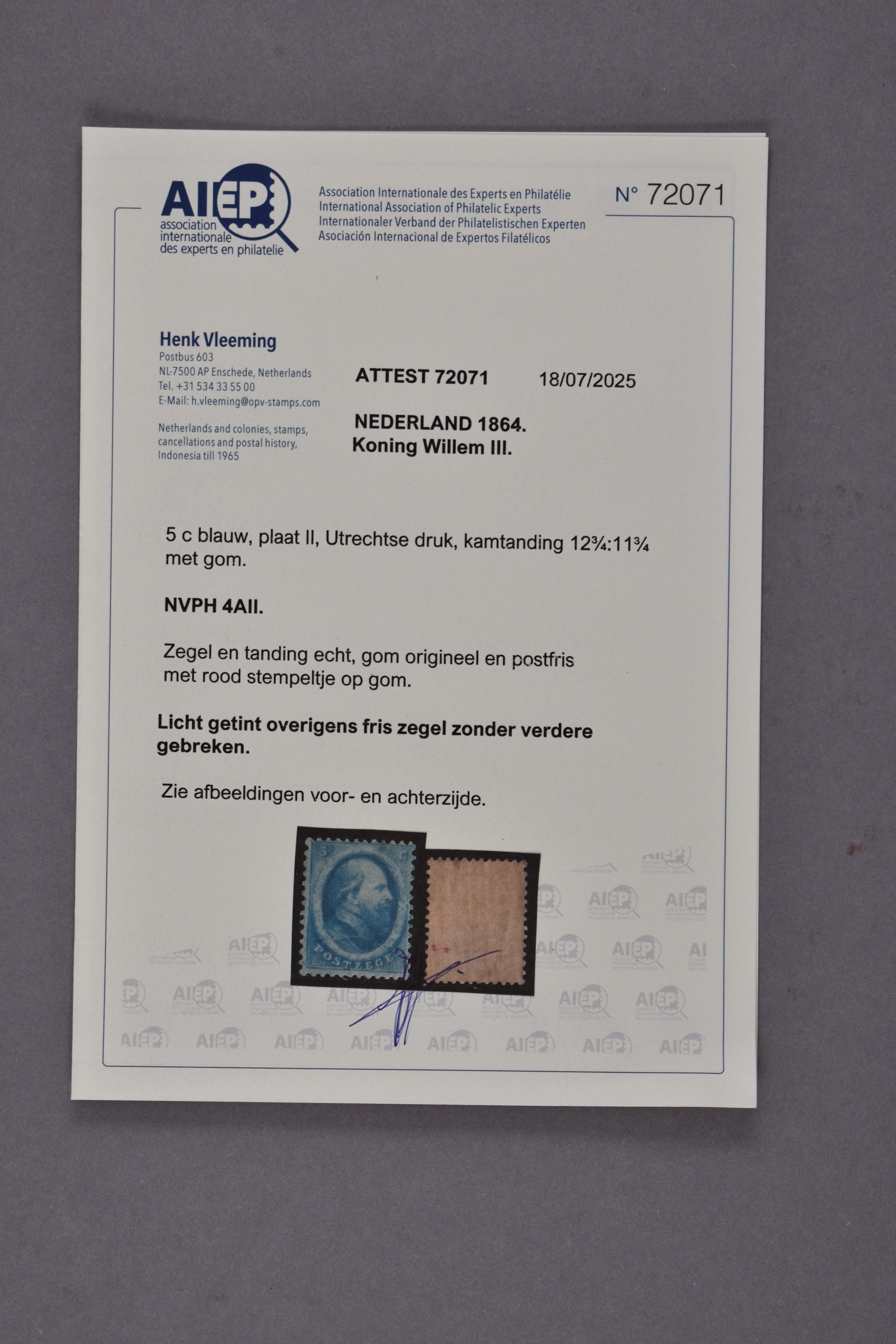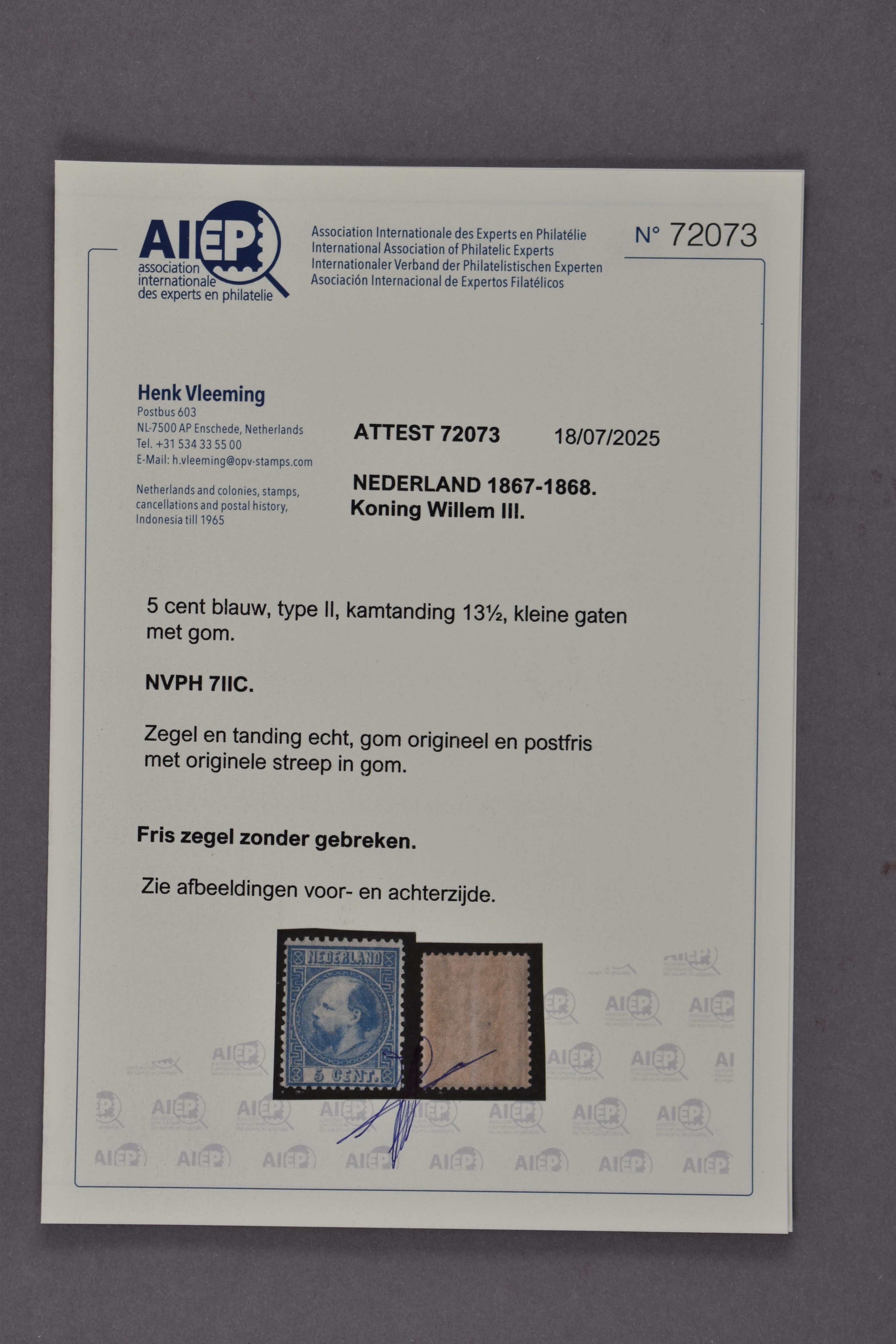 1109 nh image7IIC, 5 cent blauw, Kt. 13½ kl.g., postfris prachtex. met originele gomstreep en certificaat Vleeming (2025) € 1100 (Image) (Image2)