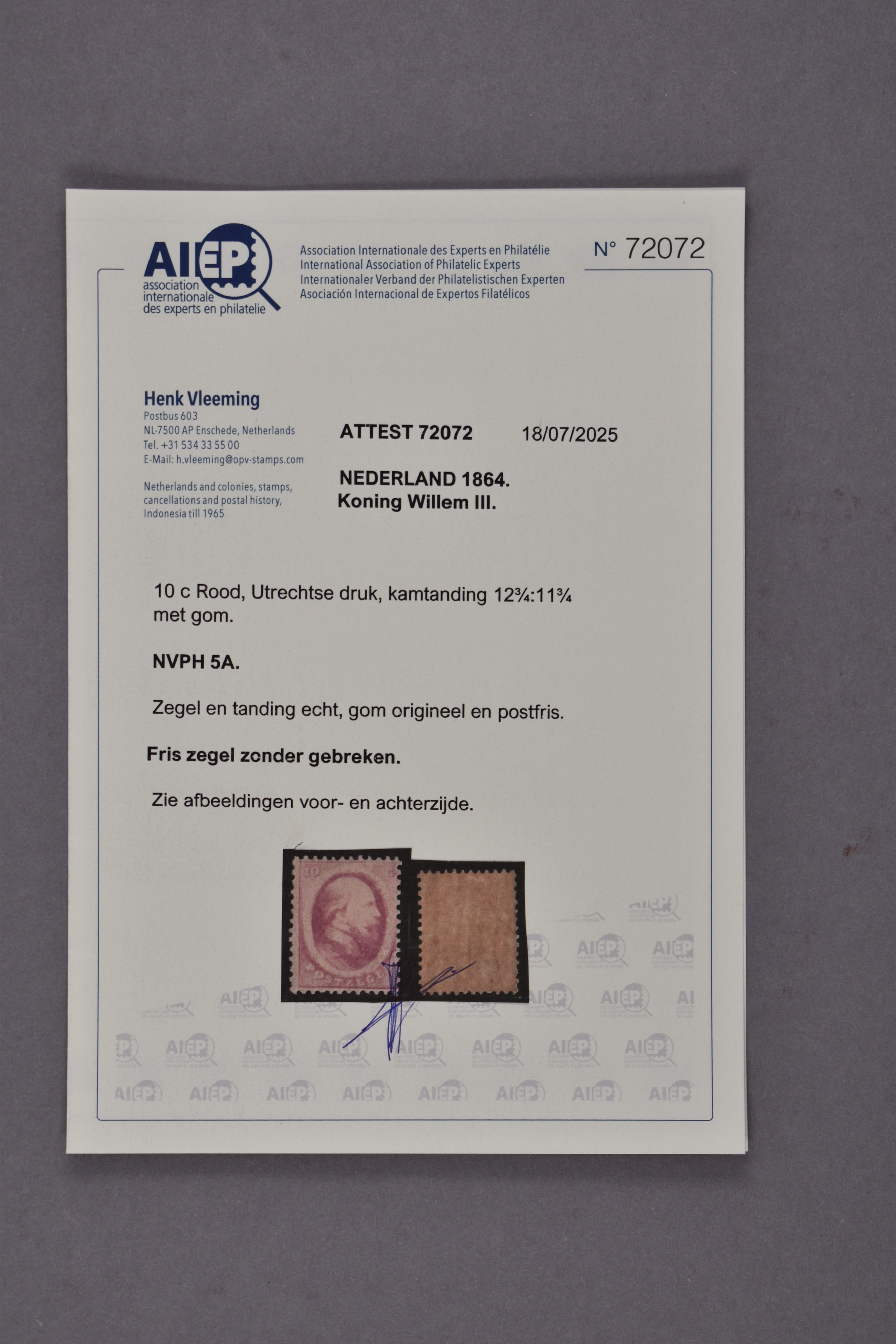 1104 nh image5A, 10 cent rood, Utrechtse druk, postfris prachtex. met certificaat Vleeming (2025) € 4200 (Image) (Image2)